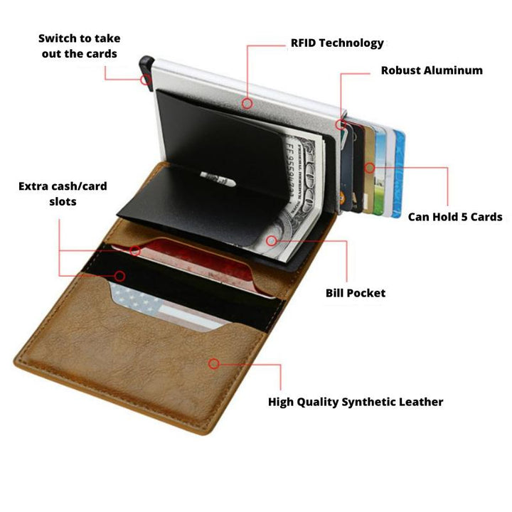 QUICK ACCESS AND LARGE CAPACITY - Digging through your old wallet should be a thing of the past. Our card holder with automatic mechanism ejects your cards in order with the flick of a switch. Holds 5 credit cards in a pop-up card holder. It also contains 2 additional pockets that can be used for other cards (driver's license, insurance card, ID card, etc.), and a compartment to hold cash or bills.