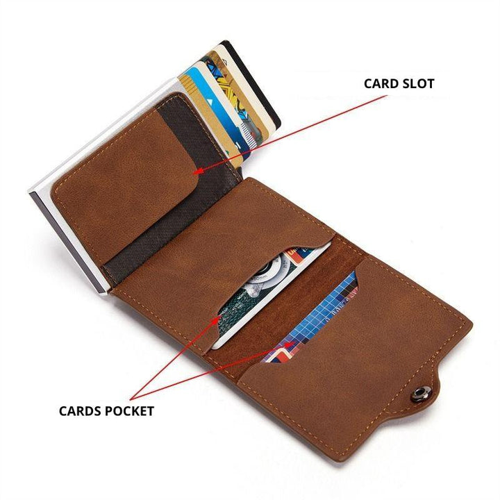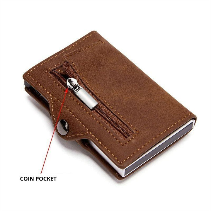 QUICK ACCESS AND LARGE CAPACITY - Digging through your old wallet should be a thing of the past. Our card holder with automatic mechanism ejects your cards in order with the flick of a switch. Holds 7 credit cards in a pop-up card holder. The zippered coin pocket on the back provides safe storage for coins. It also contains 2 additional pockets that can be used for other cards (driver's license, insurance card, ID card, etc.), and a compartment to hold cash or bills.