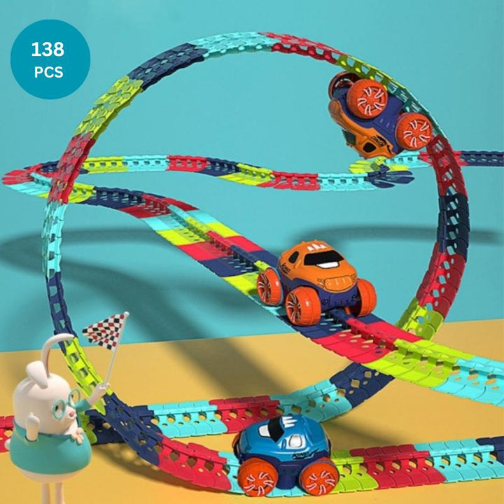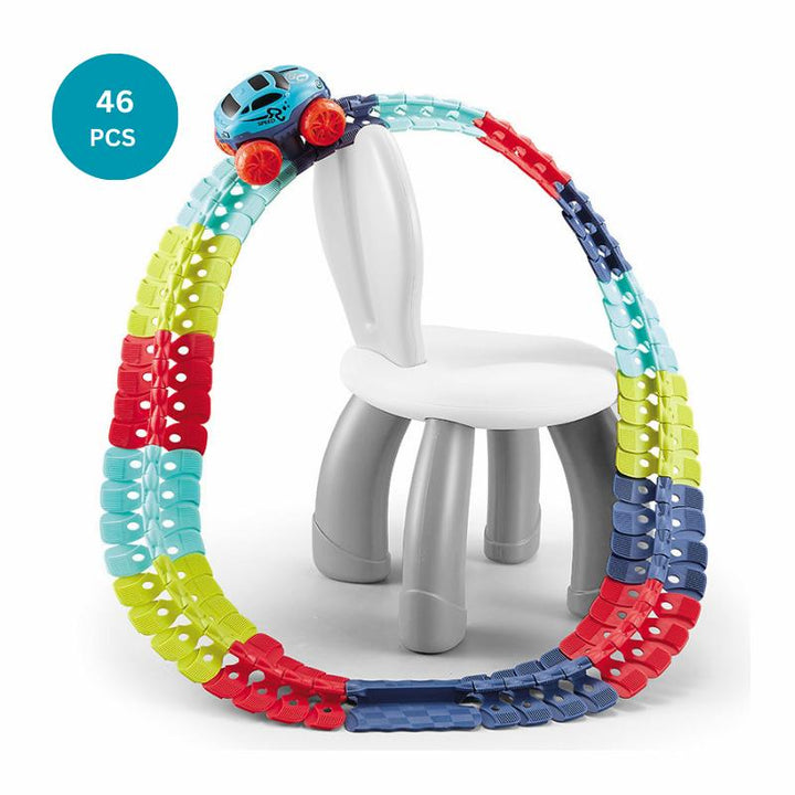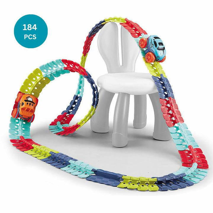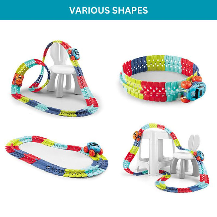 Versatile and Flexible Play: With a variety of flexible tracks, splicing options, and changeable shapes, our DIY racing track kit offers diverse play methods. The simple operation allows children to exercise their hands-on ability, encouraging them to twist, deform, and shape the tracks according to their whims.