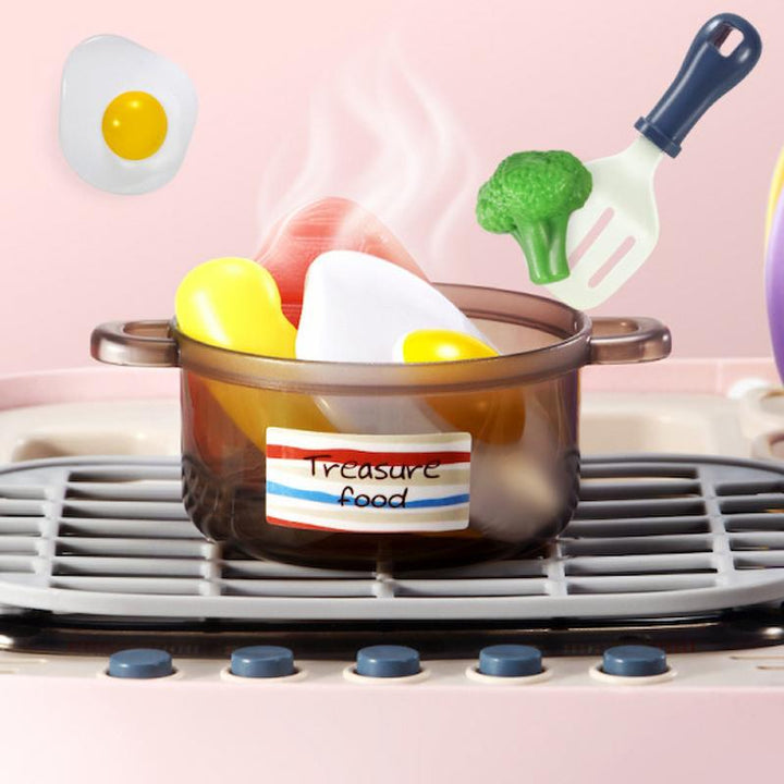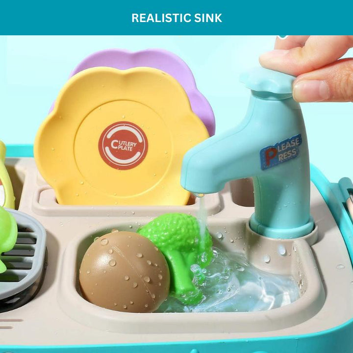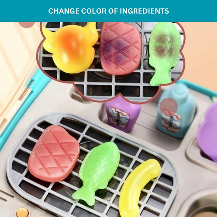 Realistic Cooking Experience: Watch the magic unfold as play foods change color when placed on the grill's cooking areas, providing a realistic cooking effect. The kitchen toys also feature a play sink with water that flows out when pressed and a simulation oven with light, sound effects, and music for an immersive culinary adventure.