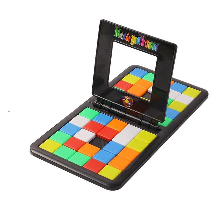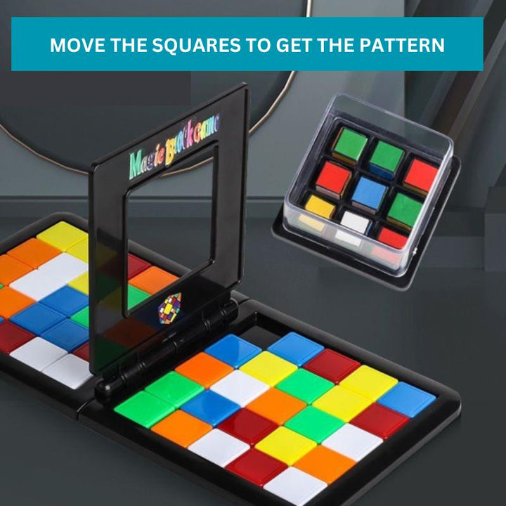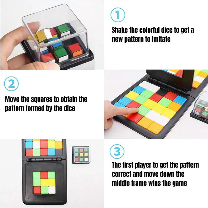 SHIFT, SLIDE & SOLVE : Shake the scrambler and go head-to-head against your opponent. Shift and slide the tiles to be the first player to match the 3x3 center pattern on the scrambler's cube design. It's a test of speed, skill, and strategy.